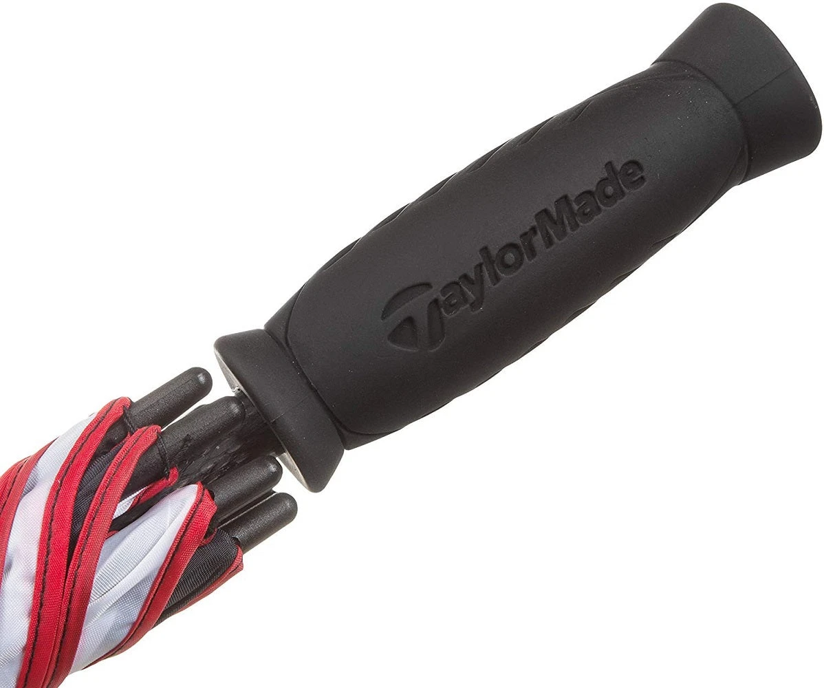 Single canopy umbrellas are useful for providing weather protection. The black and white TaylorMade 60″ Single Canopy Umbrella features logos on the two panels and a manual spring mechanism to open. The interior has vibrant red fiberglass ribs. The handle is made for comfort with textured, contour rubber grip that is ergonomically correct.